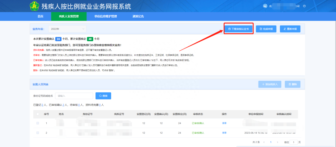 第七步:下载认定书。待当地税务系统开放后,即可申报缴纳残保金。