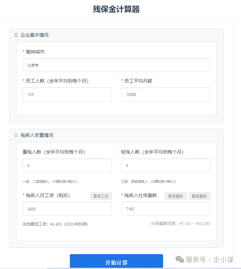 残保金政策因地区、年份而异(如北京、上海、广东等地的减免比例和计算基数均有差异)。企小谋计算器后台实时同步全国31个省市的最新政策,确保计算结果符合当地要求,避免因政策滞后导致的合规风险。